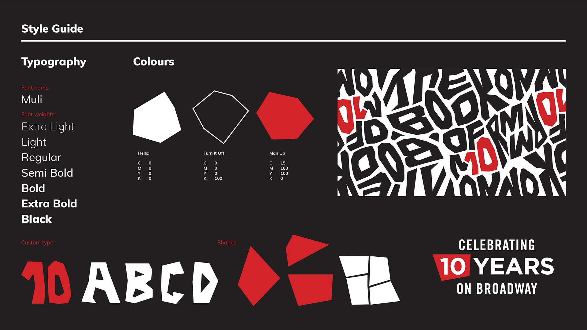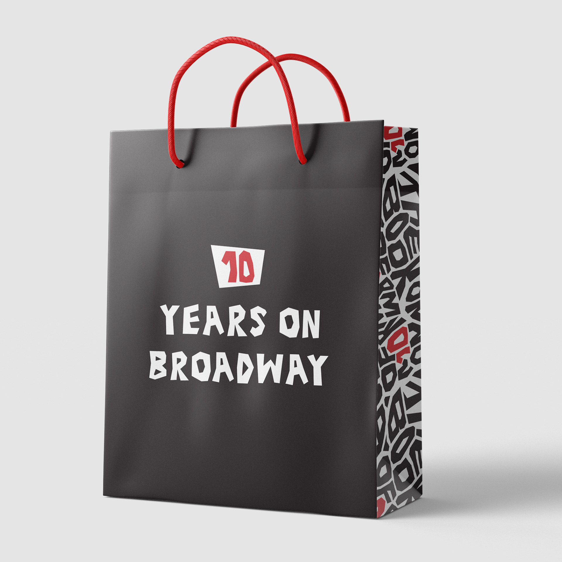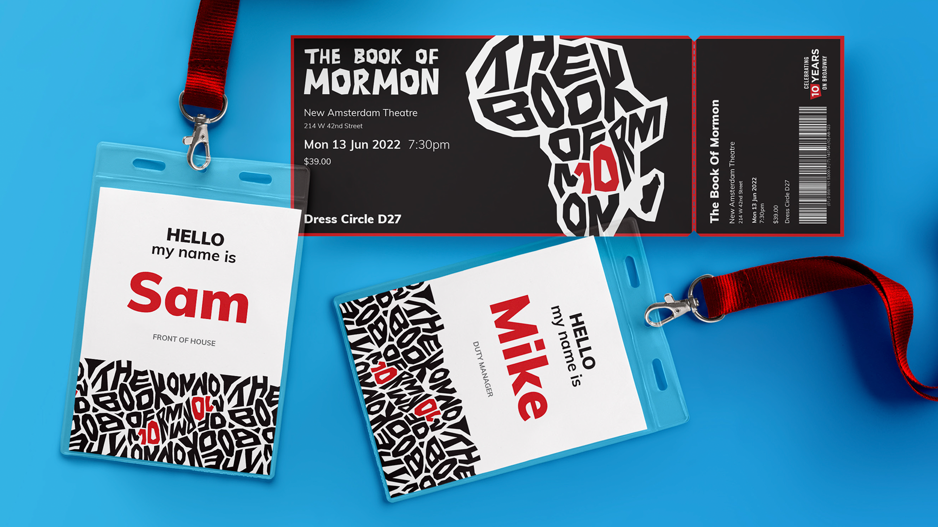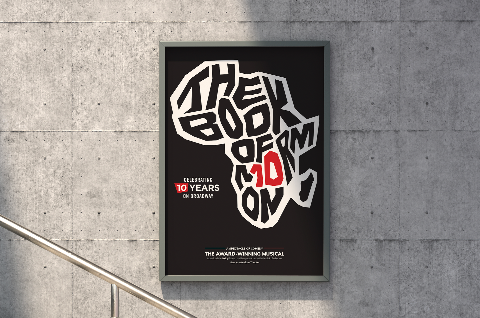 To celebrate their 10th anniversary on Broadway, I created a new identity for The Book of Mormon to accompany this event with a focus on creating an engaging type package. The show is very funny, vulgar and edgy, and I wanted to convey this through the rough handmade typeface as well as the bold and striking colour choices.